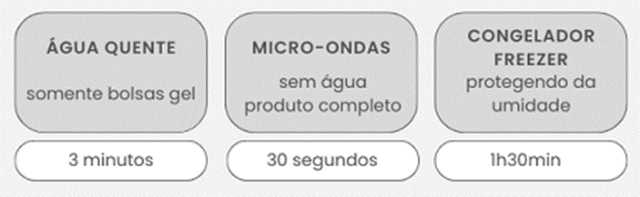 Aqueça as bolsas preferencialmente em água quente. Em um recipiente com água quente: remova as capas e mergulhe somente as bolsas de gel em 3 litros de água fervendo (fora do fogo) por 3 minutos.